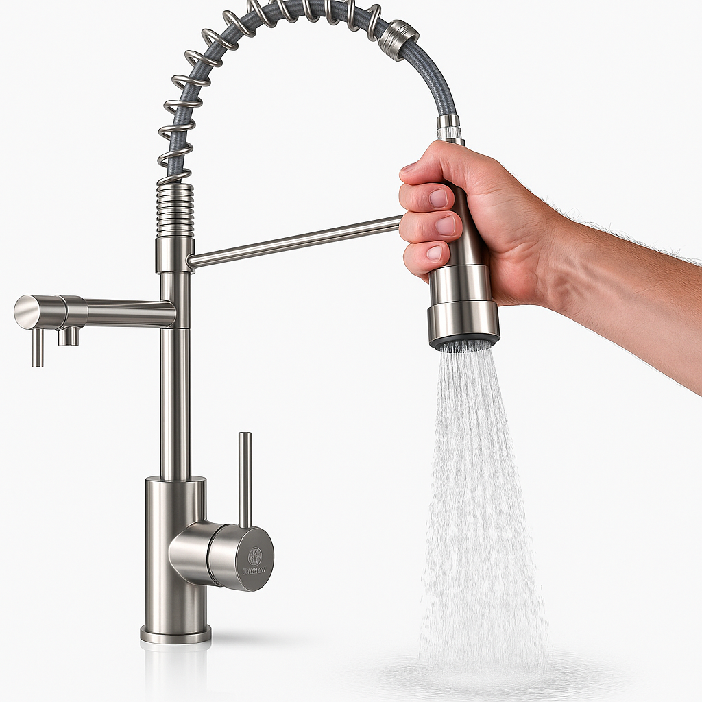 Diseñado para cocinas modernas que exigen rendimiento y estilo, este grifo monomando ofrece máxima versatilidad gracias a su caño giratorio 360° y su manguera extensible de 40 cm.